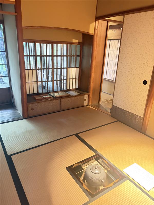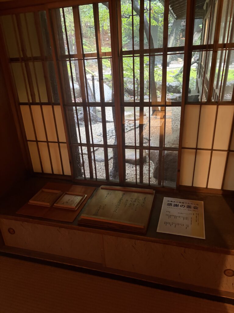 また、今回は趣向を凝らし、邸内の展示空間を「寄付(よりつき)」に見立てた特別な室礼に。画像にある「会記」も、当館らしい現代的な見立てで飾らせていただきました。