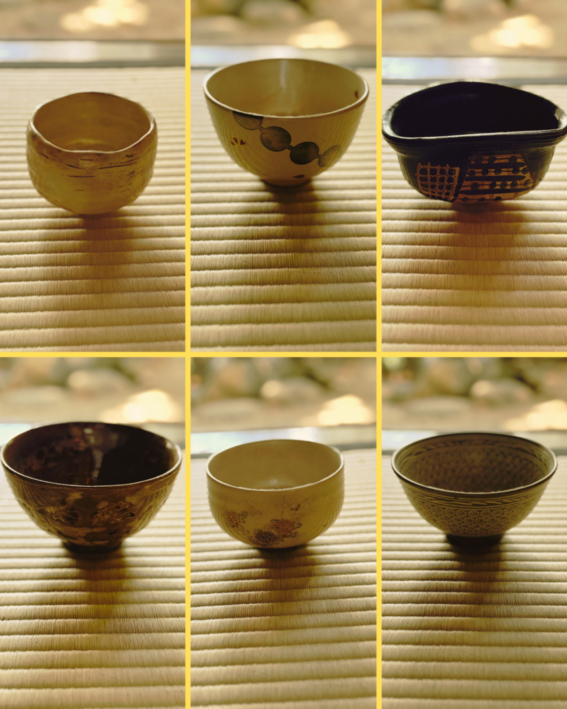 上段左より ①白楽/覚入造②16代善五郎造③黒織部沓形 下段左より ④櫻花/陳元贇造⑤薩摩/十二代寿官造⑥高麗花三島/申相浩造