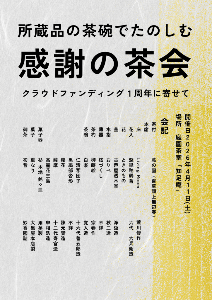 昨年のプロジェクトから1年。支えてくださった皆様への感謝を込めて、当館所蔵の茶道具を並べ、一期一会のひとときをお届けいたしました。