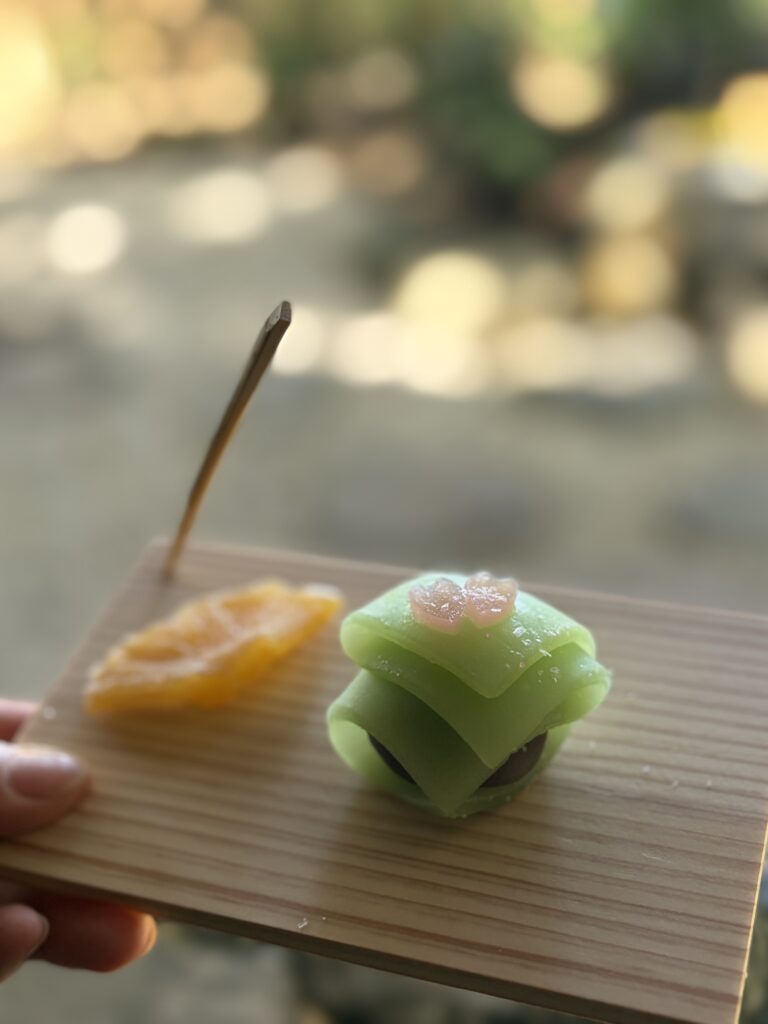 本日のお菓子は、大黒屋本店製の「重なり」(外郎製)。 重なり合う季節の喜びを表現した美しい生菓子に、蝶に見立てたドライパイナップルを添えて、春の庭園に舞う軽やかな空気感を演出いたしました。