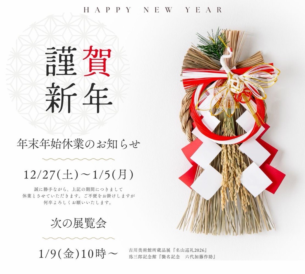 上記期間、古川美術館・為三郎記念館は休館いたします。 あわせて、爲三郎記念館内のミュージアムカフェ「数寄屋deCafé」も同時休業となります。展覧会およびカフェの開始は1月9日(金) 10:00からとなります。ご来館の際はご注意ください。