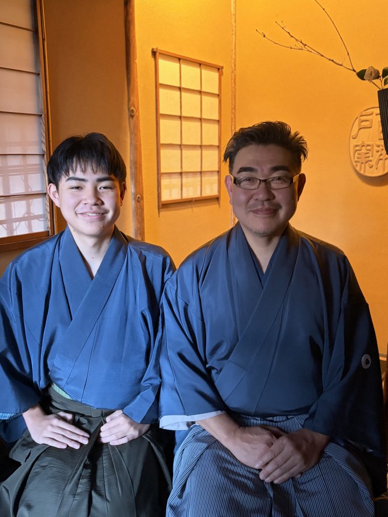 六代 加藤作助 氏(右)と、寄付きにてお客様をお迎えされたご子息(左)
