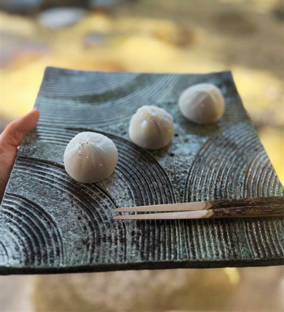 両日とも、令吉先生の作品から着想を得た和菓子をご用意いたしました。11月14日(金)は菓銘「霜日(そうじつ)」上用製 小豆こしあん、11月16日(日)は菓銘「光彩(こうさい)」ういろう製 小豆こしあん。いずれも両口屋是清製で、季節と作品世界を映す一品となりました。