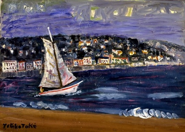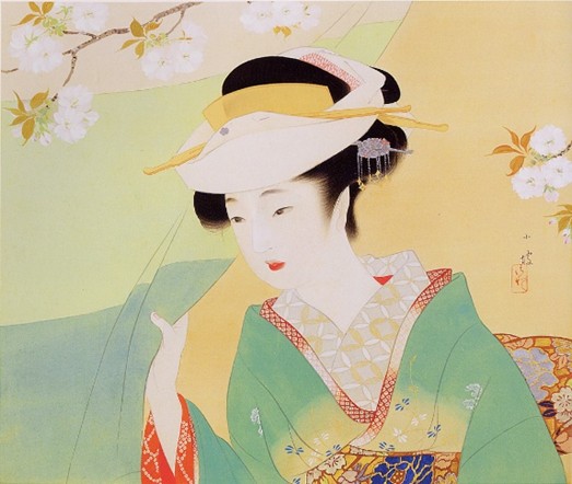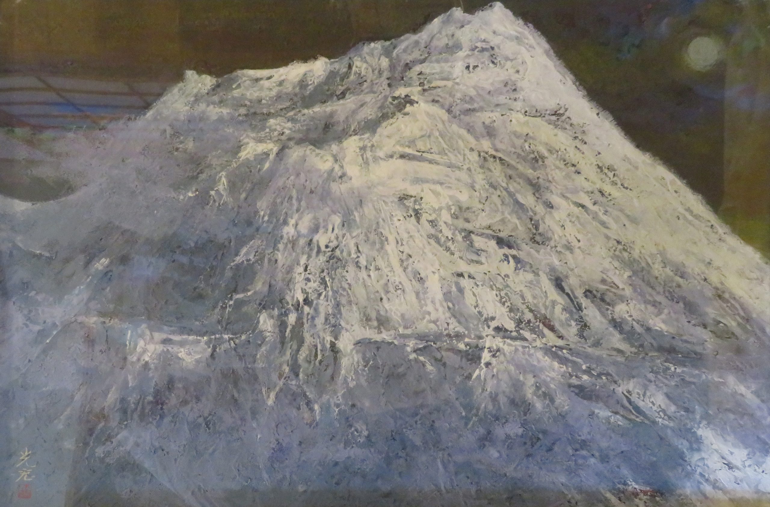 Left : Mt. Fuji by Seiho Takeuchi (1864–1942) , Below (left): Beauty Viewing Cherry Blossoms (circa 1940) by Kohaku Ito (1877–1968), Below (right): Cannes: Sea and Yachts (1969) by Tatsushiro Takabatake (1895–1976)