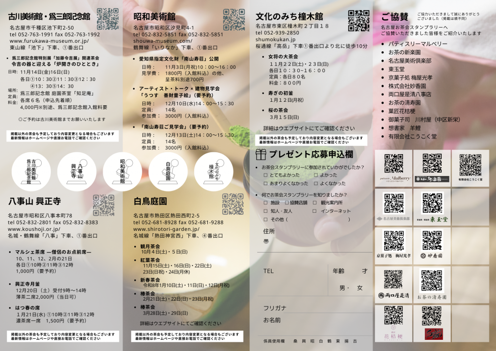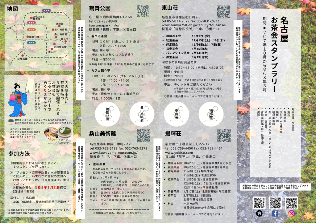 2025年【後期】名古屋お茶会スタンプラリー開催のお知らせ 名古屋市内に茶室を持つ8施設で開催されるお茶会をスタンプラリーでめぐりませんか?HPはこちら 期間 2025年10月~2026年3月 施設 東山荘 白鳥庭園 鶴舞公園 昭和美術館 撞木館 桑山美術館 八事山 興正寺 古川美術館・爲三郎記念館 揚輝荘